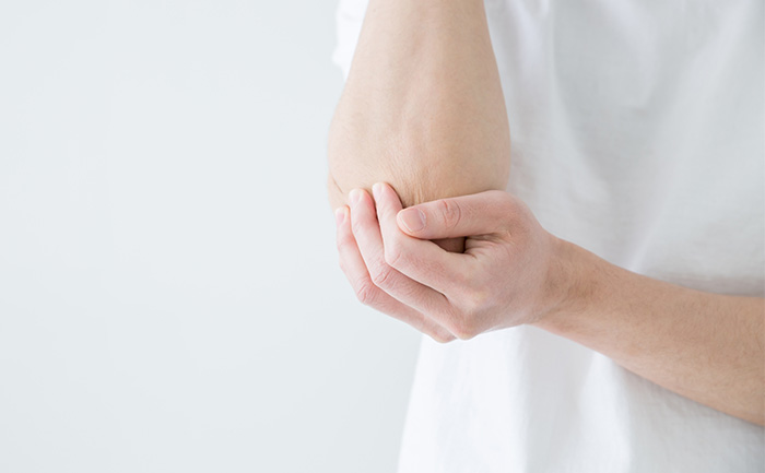 - 力こぶの周辺を触ると痛みがある